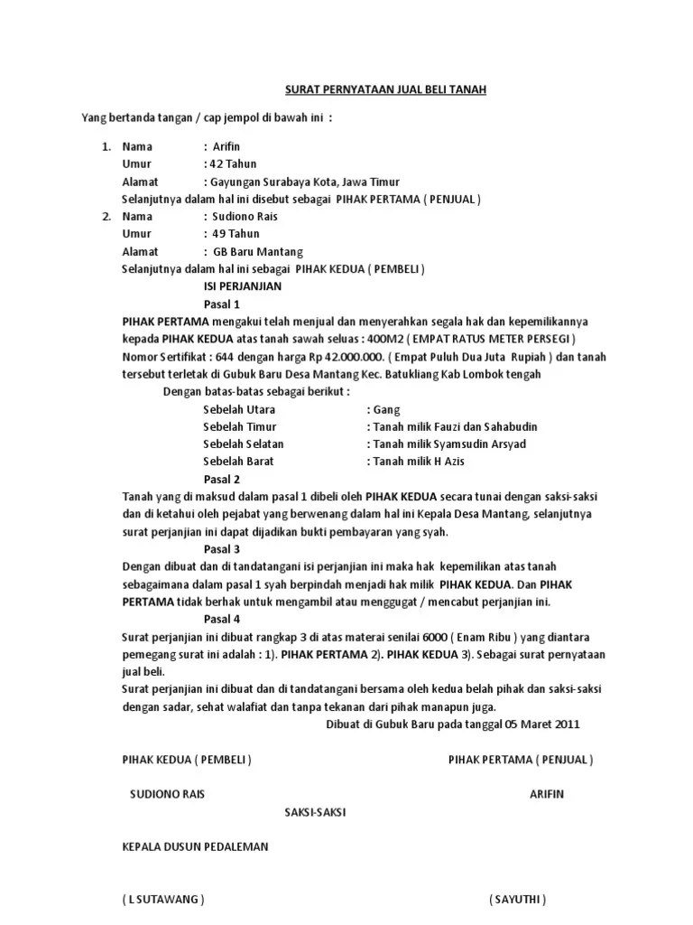 Bertambahnya unit pasokan properti lahan kini tidak hanya terbatas pada rumah hunian tapi juga rumah toko, apartemen hingga tanah. Dokumen surat perjanjian jual beli . Pihak pertama menjamin sepenuhnya bahwa tanah yang dijualnya adalah . Contoh surat perjanjian jual beli tanah. Bisa berupa luas tanah, luas bangunan, nomor sertifikat, alamat .